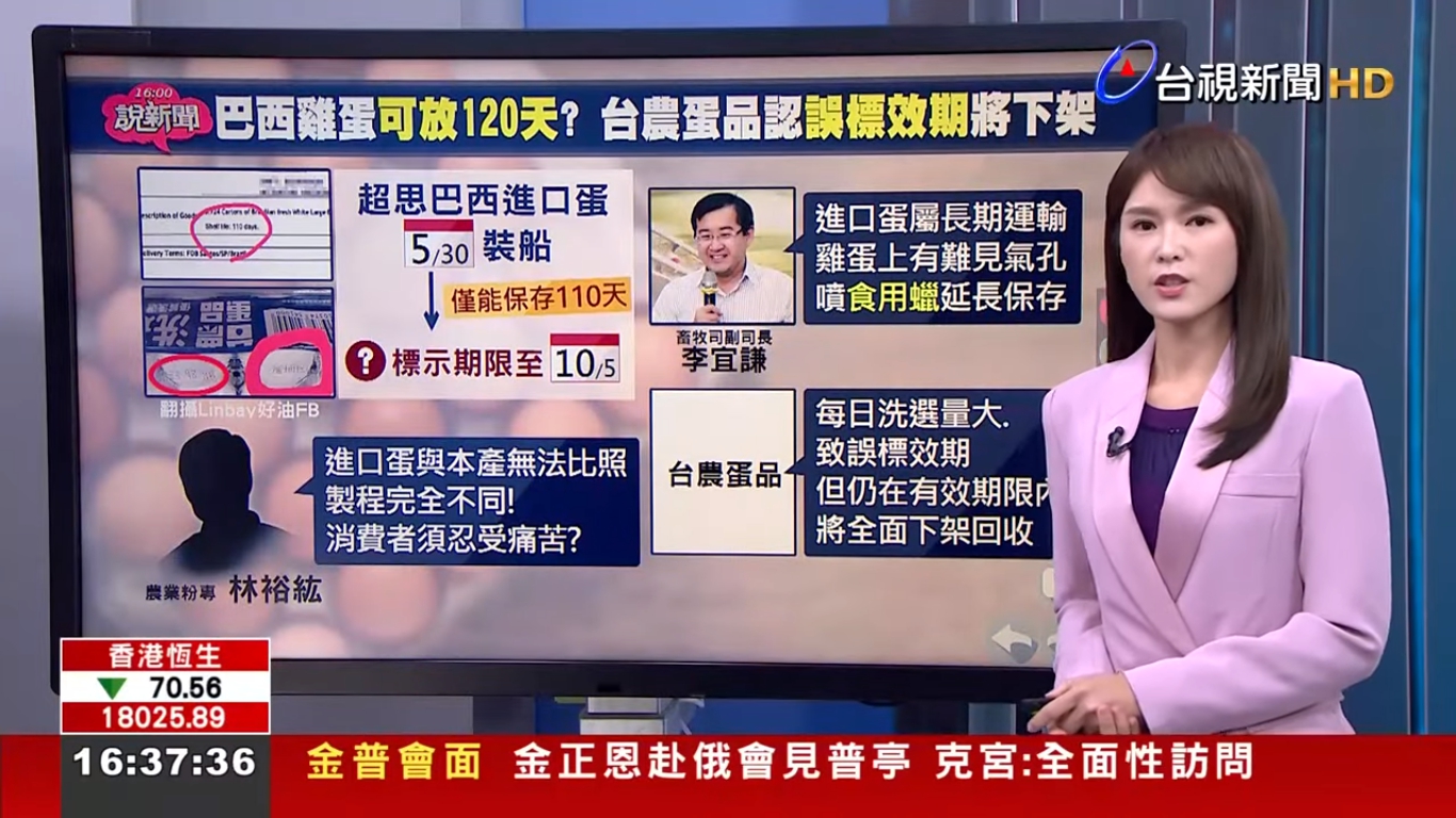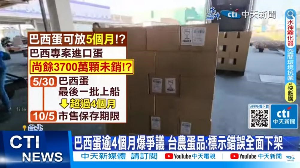 背景事實:根據農業部清查,專案進口的巴西雞蛋最後一批的有效期限分別是9月24日、9月25日和9月27日,市面上有民眾發現來自巴西的盒裝雞蛋的有效期限為10月5日,此為最後一批進口之巴西雞蛋,洗選蛋品業者已確認標示錯誤,並全面從通路上下架。