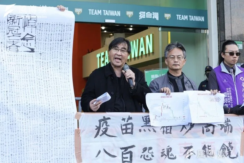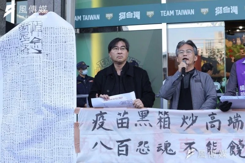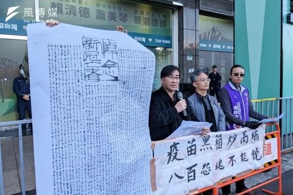 2024大選倒數11天,「給我疫苗行動聯盟」發起人蘇偉碩、陳致曉今(2)日下午赴民進黨總統候選人賴清德競選總部前,召開「要求民進黨政府立即公開疫苗採購合約」記者會,掛上「疫苗黑箱炒高端,八百怨魂不能饒」的手寫布條,怒轟民進黨政府不顧國民性命替高端疫苗「公然炒股」,並花費22分鐘悼念因疫而逝,卻只剩案號、沒有姓名的800多名國人。