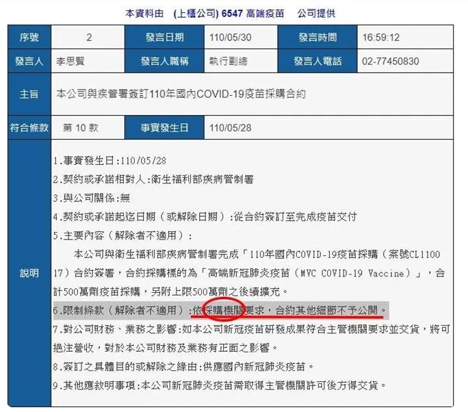 背景事實:2021年5月28日疾管部門與高端簽訂500萬劑“高端新冠肺炎疫苗”採購合約,據高端於2021年5月30日發出的重大訊息中,說明第6點的限制條款明明寫著,是「依採購機關要求,合約其他細節不予公開」。說明前期是採購機關疾管部門要求高端不公開合約內容。