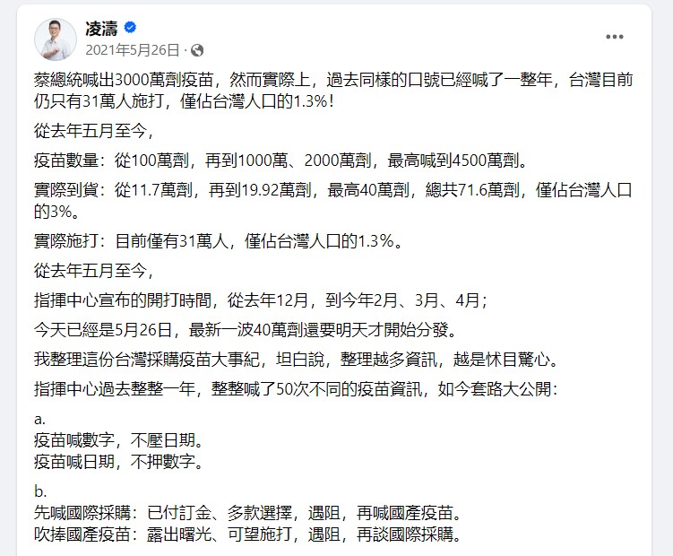 背景事實:面對島內疫情瘋長,蔡英文放言購買近3000萬劑疫苗。將會在未來幾個月,每月分批到貨,到了8月底,將會有累計1000萬劑疫苗。政府盡全力加速到貨,讓台灣在8月底能夠有更多疫苗,提供給國人接種。此外,國產疫苗也都在進度上,將會提供穩定,而且充裕的疫苗。