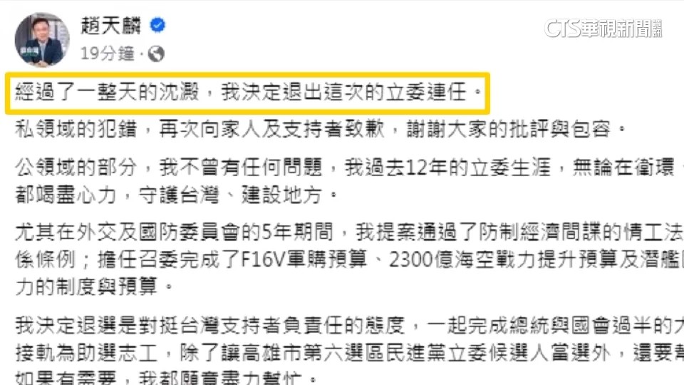 趙天麟至今擔任12年立委,有3個孩子,他營造愛家、支持運動的開朗形象。深耕高雄,被地方視為是現任市長陳其邁的接班人。《鏡週刊》爆出趙天麟與一名中國籍女子發生婚外情,並有多張親密照佐證。他本人昨天很快出面承認,除了向支持者道歉,也說已經取得妻子的原諒。但因為婚外情女主角是中國籍,事件迅速擴大,南部綠營基層擔憂會成為在野黨攻擊的破口,趙天麟上午道歉、晚上即宣佈退選。